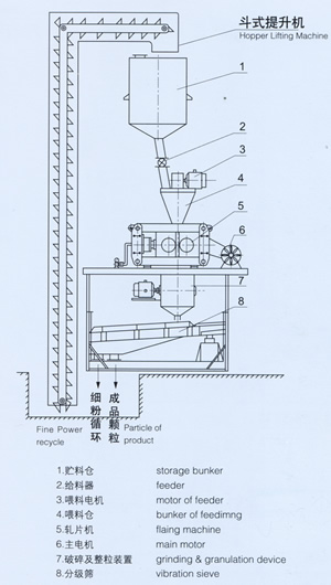 原料由加料口通過螺旋輸送機進入斗式提升機,由斗式提升機將原料粉末送入振動式原料倉,通過定量加料機將物料送入變頻式螺旋喂料機,對物料進行預壓縮,經(jīng)預壓縮的物料被壓入兩個相對轉(zhuǎn)動的兩對壓輥中間進行壓實,其壓實力是通過油缸的推力由壓輥傳遞給物料的,被壓實的片狀物料自動脫槽進入破碎機,將其破碎成大小不均的顆粒體,然后進入整粒機進行修整。被修整的顆粒通過帶網(wǎng)孔的篩板被擠壓出來進入篩分機,成品顆粒通過篩分后進入斗式提升機被送入成品倉。篩分下來的粉狀物通過螺旋輸送機返回原料倉,再次壓實由此完成一個封閉式循環(huán)。